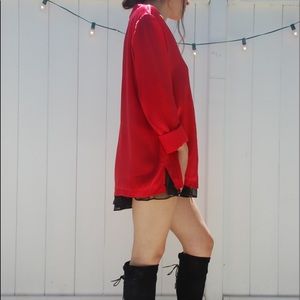 This is a beautiful buttery soft 100% silk sleepwear men's button up shirt styled as a shirt dress. It's paired with a simple lace slip and knee high suede boots. It's a size XL. Model is 5'4 waist 26'', because of its loose fit it can work with most sizes. In great condition, with small stain below the button as pictured on the last photo.