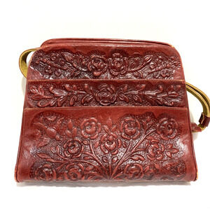 Vintage tooled leather handbag - red floral design purse - Boho southwestern themed retro bag. All leather with hand work on virtually every surface - unlined leather interior - zip top with unique zipper pockets on both sides along with exterior slide pockets. There are some scuffs on the trim edges (see pictures) but overall this bag is in exceptional vintage condition - just stunning!