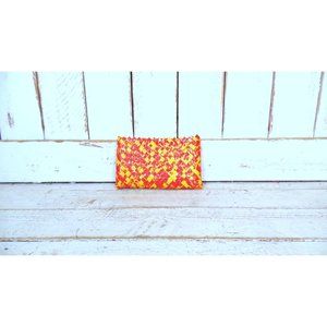 Vintage red/yellow plastic label folded basket weave clutch purse/handmade/recycled plastic small zipper clutch wallet