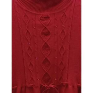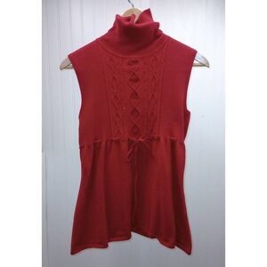Pre-owned vintage red sweater. Sweater has beautiful knitted pattern with small red beads, tie waist and flared bottom. Sweater has turtleneck and a sleeveless.medium weight