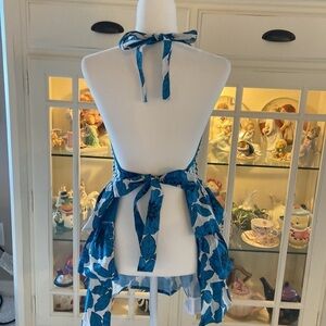 Beautiful in the kitchen or looking good while protecting your dress 100% cotton quality made ruffled with pretty bib top. One size fits most.