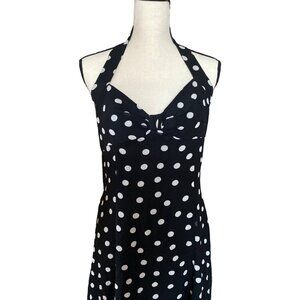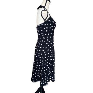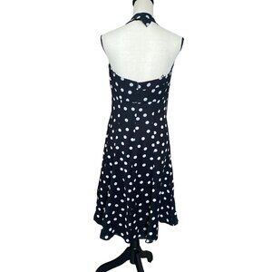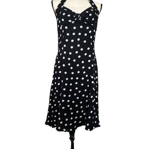 This vintage black & white polka dot dress by Maggy London is designed for women in retro style 1950s pinup rockabilly. Made of silk and polyester, this size 10 halter neck dress adds a touch of nostalgia to any wardrobe.