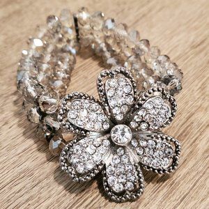8" bracelet has beaded, flexible strands. 1.5" flower diameter. Strands interconnected with silver spacing bands.