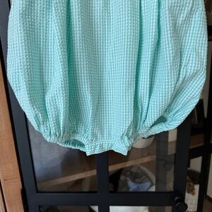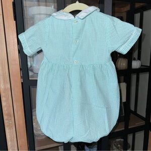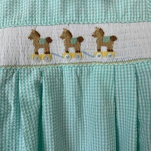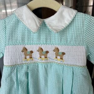 Vintage rocking horse smocked bubble romper embroidered seersucker baby boy 80s