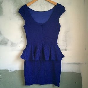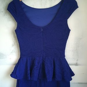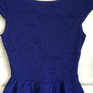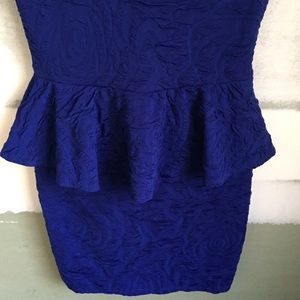Gorgeous stretchy textured royal blue vintage bodycon dress with ruffle skirt by Arden B. Very flattering stretchy and comfortable fabric that had texture which outlines roses. Hard to show in the pictures but very cool fabric! Size Small.