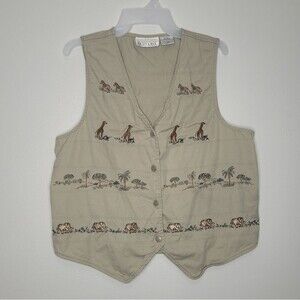 Vintage safari giraffe elephant button front tan tie back quirky vest size large