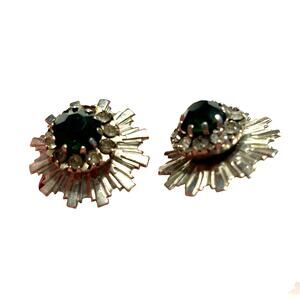 Vintage screw back earrings textured silvertone metal settings & deep green rhinestone center stones. No hallmarks - nice quality fashion jewelry - fantastic mid century look. In excellent condition - minor surface wear - no apparent damage or flaws - just stunning!