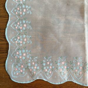 Vintage semi sheer nylon embossed pink & blue floral embossed handkerchief with scalloped edges