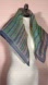 Unique double sided semi sheer scarf; one side is pale slate blue the other a charming Kelly green, blue and a warm yellow Orange stripe. Fun thicker scarf that seems to be two scarves sewn together. A few slight imperfections