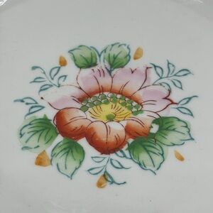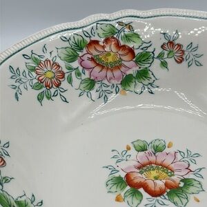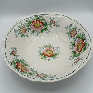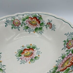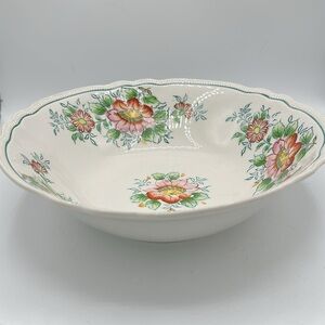 Vintage serving bowl with flowers. Good preowned condition. I believe it is porcelain but I am no expert. Made in Japan. Measures 9” across and 2.5” tall. White with green, orange, pink, yellow, teal floral design.