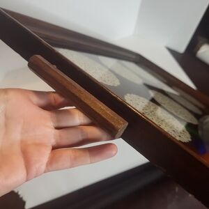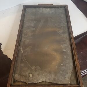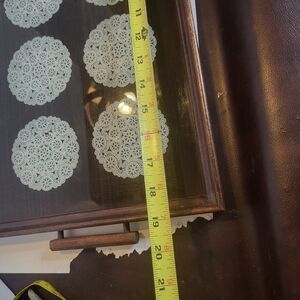 Beautiful dark wood and glass topped serving tray. wood handles. customized with 8 ornate paper doilies. back paper cover has some water damage, but otherwise, it's a beautiful tray.