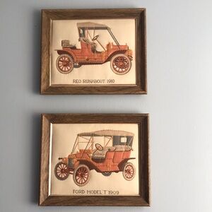 Vintage set of two fabric printed wall art, with padded images of a Reo Runabout 1910 and a Ford Model T 1909 in beige with pumpkin, brown & gray colors, with a distressed wooden frame.