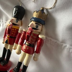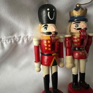 Vintage set of 2 wooden nutcracker, soldier figure hanging Christmas ornaments, moveable mouth, 4” tall x 1.5” wide, very good condition