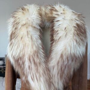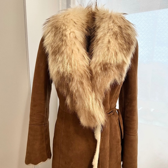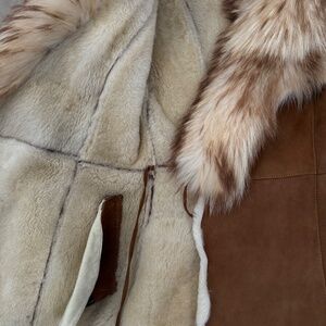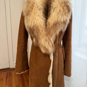 100% sheep shearling coat with genuine Fox collar. Tie closer, pockets.