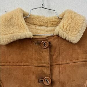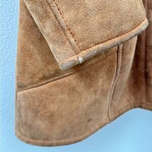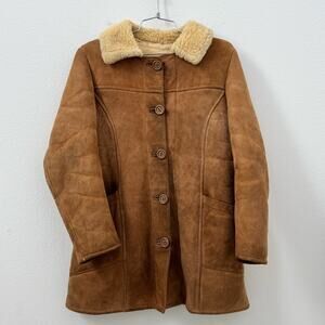Vintage shearling leather jacket. No tags. Seems handmade. Fits like a modern small. Very warm- a true winter coat. Approximately 19” pit to pit and 29.5” in length. Waist is approximately 35” on the outside but fits snug because of the thickness of the shearling. See pics for condition—suede is worn-in.