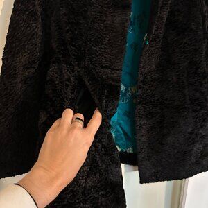 Black fuzzy shearling-style jacket with pockets, that can be reversed into a silk jacket with a cozy lining. No size listed, but this fits like a size 6
