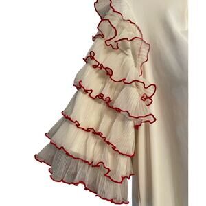 Absolutely beautiful vintage nightgown in a classic style, button all the way down the front but with a beautiful sleeve detail. The sleeves are layers of sheer ruffles with red trim. Great vintage condition with a couple of spots on front. That would need some treatment. Please see pictures for condition. Excellent piece to add to your vintage wardrobe. By Saramae lingerie, size small