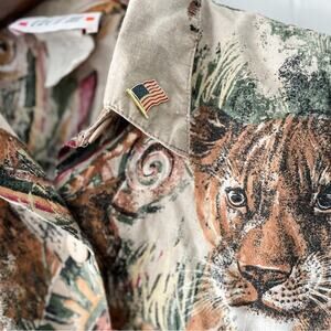 Amazing vintage Act III short sleeve button down jungle tiger & cub print safari shirt! How can you not love this? 100% cotton. It had the little American flag pin on the collar when I found it, so I kept it there :-)