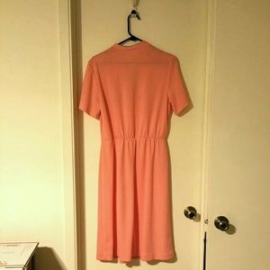 Peach short sleeve dress with lavendar trim. Vintage and in excellent condition. NO TAGS on this, but it fit me when I was a size 18. Knee length.