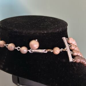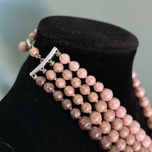 Vintage signed Japan 4 strand baroque style faux pearls. Baroque pearls are pearls with an irregular, non-spherical shape - while these are faux they are created in that style. Ombre light beige to a dark coffee color - I call it the latte necklace. 15" though adjustable to 13" smaller depending on how you prefer your choker to fit. Preppy and perfect.