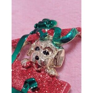 Vintage signed rare CAJC puppy christmas present Brooch Pin enameled red green