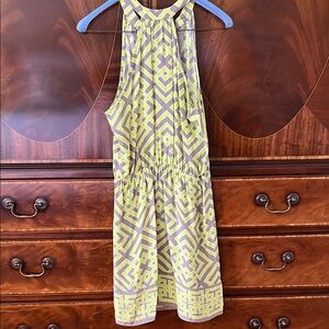 Stylish vintage Alice & Trixie 100% silk geometric patterned dress featuring a vibrant chartreuse and tan Greek key inspired design. Perfect for spring with wrap sandals.