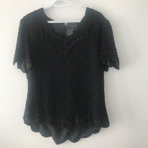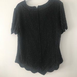 GORGEOUS vintage silk blouse with beading and scalloped edges. This is in great condition. The shell is 100% silk, lining is 100% polyester. This is a very elegant top that I'm sad to part with.