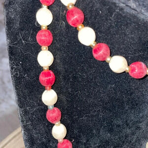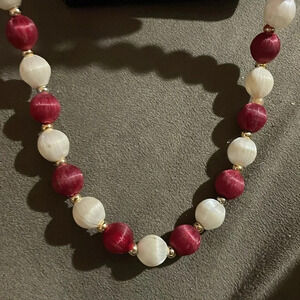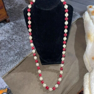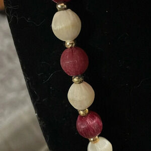 Vintage silk thread bed necklace c color dark red /white , length 29”