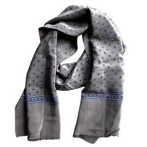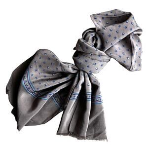 Vintage silky long rectangle scarf in a unisex look and pattern. Taupe brown & blue detail print with unfinished / fringed short ends. No tags but this feels like silk. Gently worn - no flaws.