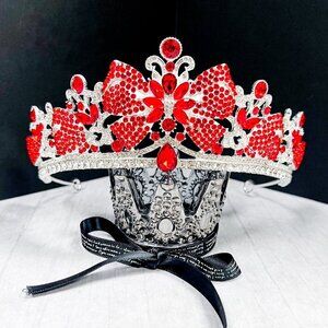 Vintage silver Crown, Red bow tiara, Classic wedding Crown, Crystal Crown Tiara