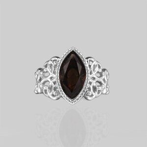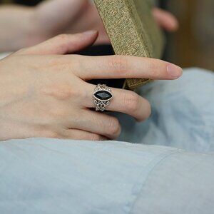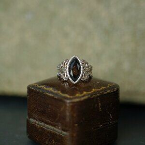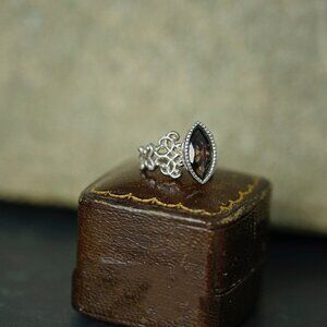 Vintage silver hollow ring, inlaid with dark brown marquise-shaped gemstone ring