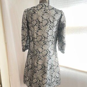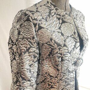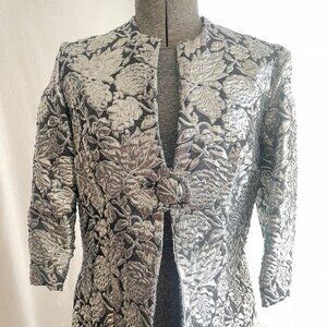 This is a vintage beauty! Fabulous silver metallic jacquard single-button jacket. Car coat length with three-quarter sleeves. Would be stunning atop a little black dress, or over some cigarette pants -- or even just a turtleneck and jeans! A gloriously versatile show-stopper piece! Some errant threads -- it's the nature of the fabric -- but overall in great vintage condition. Fully lined. Unbranded and no size tag -- so please see photos for all the amazing details and for flat sizing!