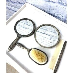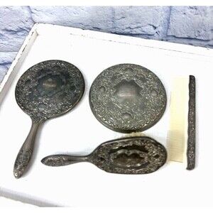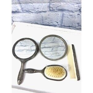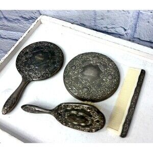 This vintage silver plated dresser set is a stunning addition to any collection. The set includes a mirror, brush, comb, and powder dish lid, all crafted in sterling silver plate. The intricate pattern is reminiscent of American Victorian style, while the Victorian era design is simply stunning. The set is perfect for anyone who appreciates the beauty of antiques. The age of the set is unknown, adding to its mystery and charm. This set is a must-have for collectors of brushes and grooming sets, and would make a wonderful gift for anyone who loves vintage items.