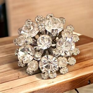 Vintage Rhinestone silver tone cluster pin brooch with multi-sized round faceted rhinestones in prong settings, rivet set , 1.5 inch diameter, stunning, classy, cosplay, work, themed, jewelry, pin back, starburst, prongs, well made,
