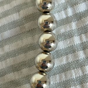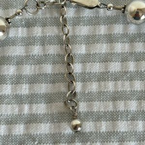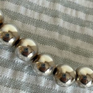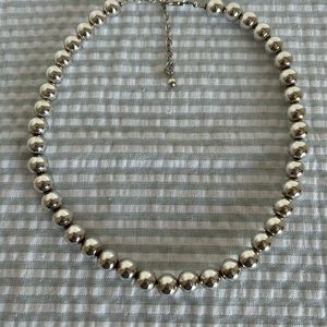 This is a classic. Silver-plated beads strung together for the perfect go-with-anything necklace. Vintage piece but in great shape. Adjustable chain. Measures 19" end to end.
