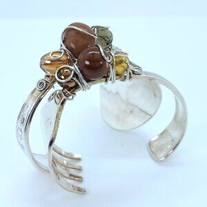 Vintage silverware bent into bracelets with wire wrapped stones.