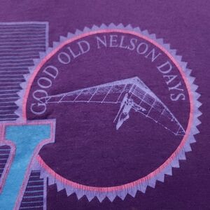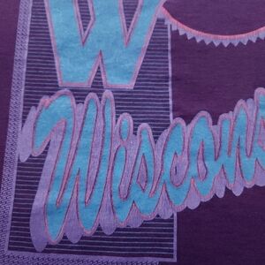 Vintage single stitch sz XL Wisconsin Graphic Tshirt. Purple with Blue and pink spellout. Good old Nelson Days on graphic. Good used condition, don't see any holes. Couple small spots on it (pics). Flat measurements approximately
