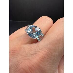 Genuine Swiss and Sky blue topaz gemstones prong set in authentic 925 sterling silver that likely plated with rhodium . Measures a size 7. Total weight is 4.53 grams. Stamped 925 SAM India. Early 2000’s era.