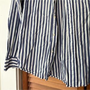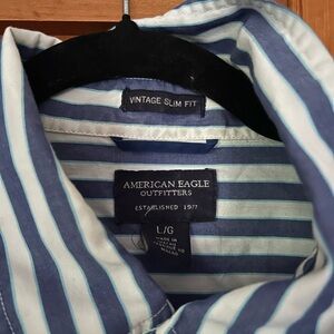Lightly used vintage slim fit dress shirt or button down from American eagle! Beautiful shirt. No blemishes whatsoever. Nice indigo and light blue details in the stripes. Looks great on anybody!