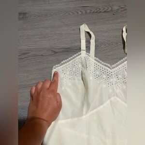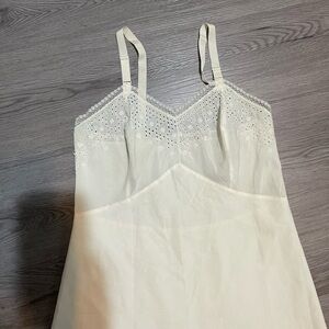 This dress is true vintage and does have flaws. Some lace trim has come apart and does need to be stitched back on. Does have small hole near back where strap is that can be easily stitched as well.