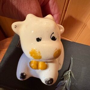 Vintage small ceramic cow planter, Charming in cream with black accents. Perfect for succulents or smaller flowers, toothpicks, q tips etc.. the uses are for this vintage small planter are endless (was stuffed with papers from 1993) this cow planter Perfect for small plants or as a decor item. Great collectible. Thanks for looking!