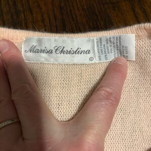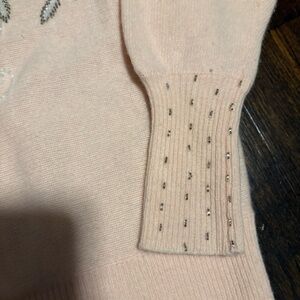 Vintage soft pink wool swea with silver and white beadwork.