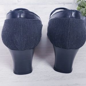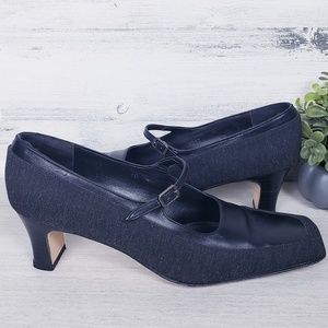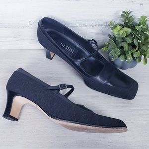 Cute and practical mary Jane style shoes from III State. Edging is a shiny leather. Body of shoe is a dark grey canvas like material. Features chunky heel. Adjustable cross strap. Fits true to size Made in Spain. Librarian, witch, Halloween, office wear, work wear