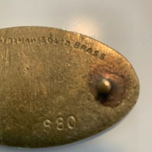 Vintage JEEP Solid Brass Oval belt buckle. It measures approximately 3-1/8" x 1-3/4", it fits up to a 1-3/4" wide belt. Back is stamped SOLID BRASS, TAIWAN and 880