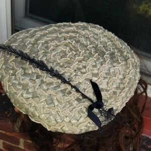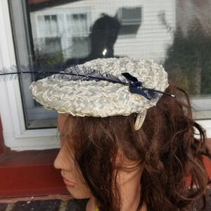 This hat is the bomb ! Although missing original netting, it is still super. And will stay on. I put it on in mild wind ..no issue..bendy pieces on sides work. Late 40's or 50's. 50% offers will not be accepted . This piece is rare and in really good condition for age.