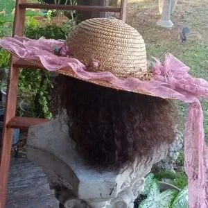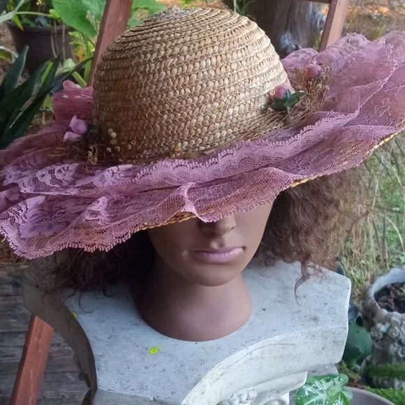 Vintage straw hat with mauve lace and floral trim