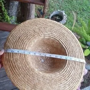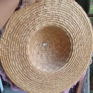 Style: Women's vintage straw hat with two tiers of lace trim above the brim. Trailing bow at rear. Floral accent above lace.