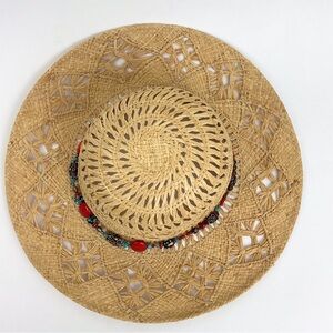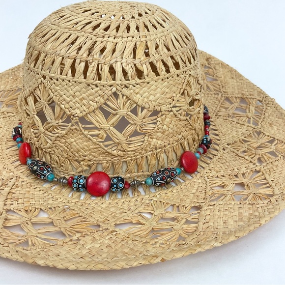Vintage open weave 100% straw hat with one of a kind handmade beaded hat band.