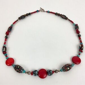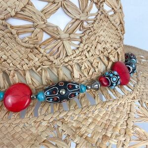 Hat band can also double as a necklace, it’s removable and made from vintage mostly metal beads in a nice red and turquoise color combo.