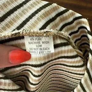 Vintage striped short sleeve button front top with waist tie size small. I think it’s either from the 60s or 70s. No brand tag if size tag but I recommend for a small or extra small. Please use the measurements for accuracy. Overall length not shown but it is 25 inches. Stripes are brown, white and tan. Two front pockets as well.